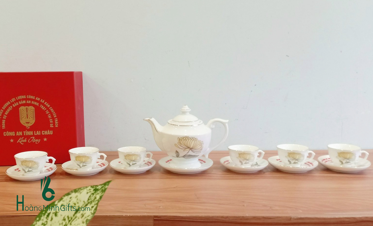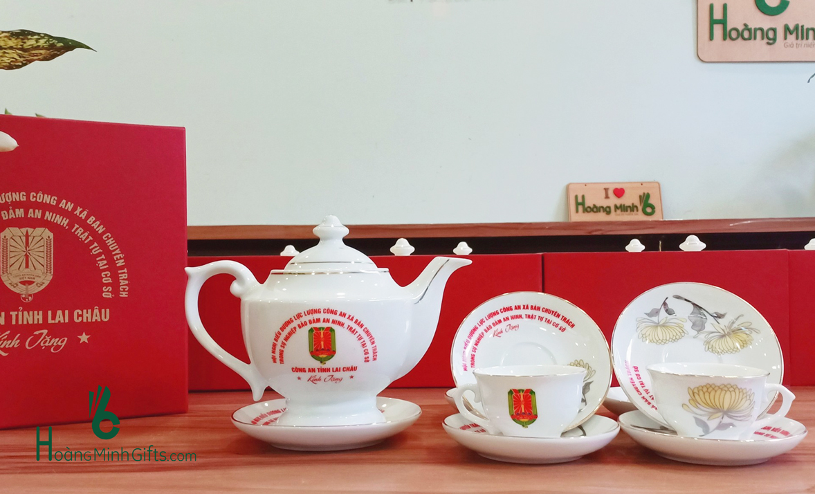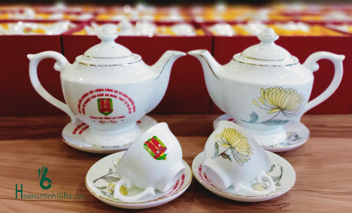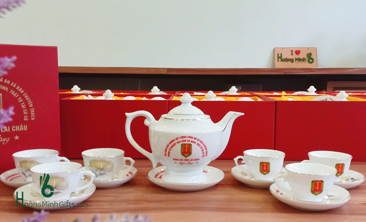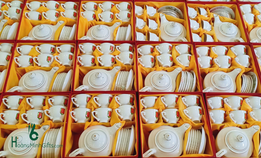 Bộ ấm chén sứ trắng Bát Tràng gồm 1 ấm, 6 chén, 6 đĩa, đựng trong hộp giấy lót lụa, in ấn logo theo yêu cầu
