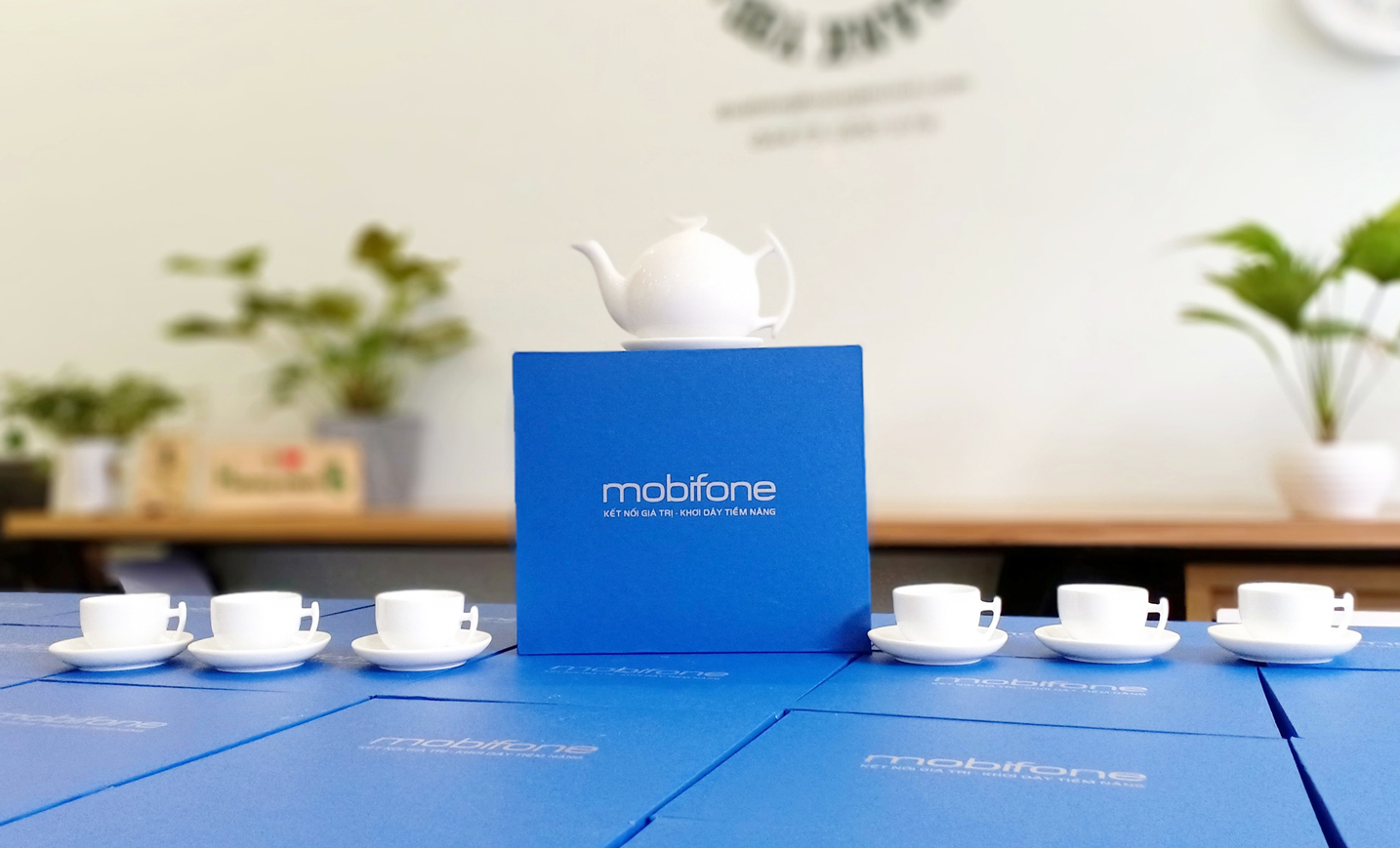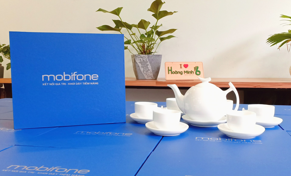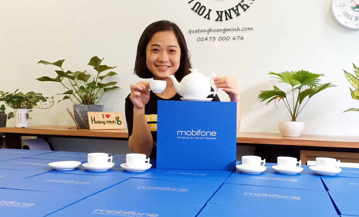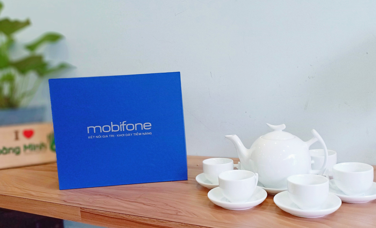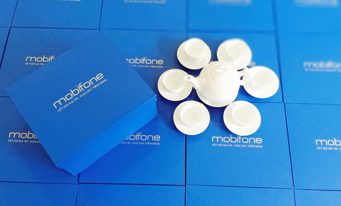 Bộ ấm chén sứ trắng Bát Tràng gồm 1 ấm, 6 chén, 6 đĩa, đựng trong hộp giấy lót lụa, in ấn logo theo yêu cầu