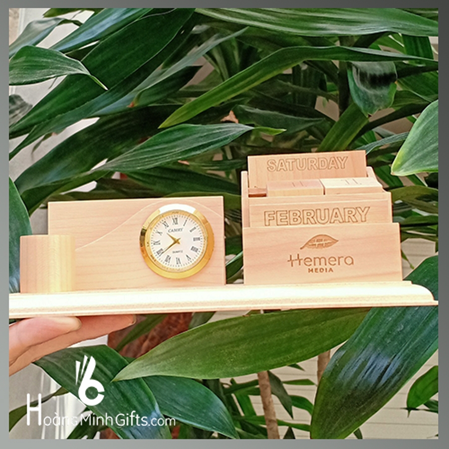 Bộ đồng hồ lịch gỗ xúc xắc để bàn, kết hợp khay cài card, ống cắm bút