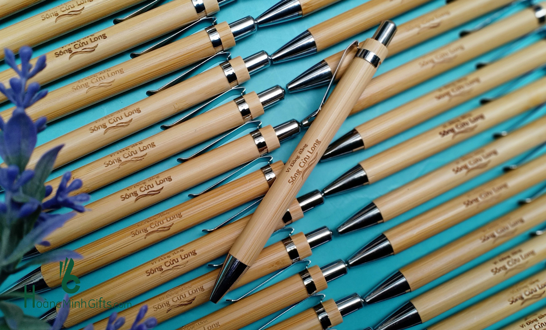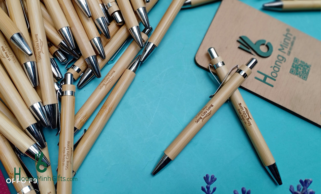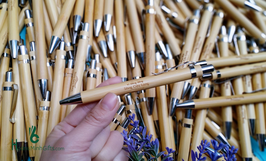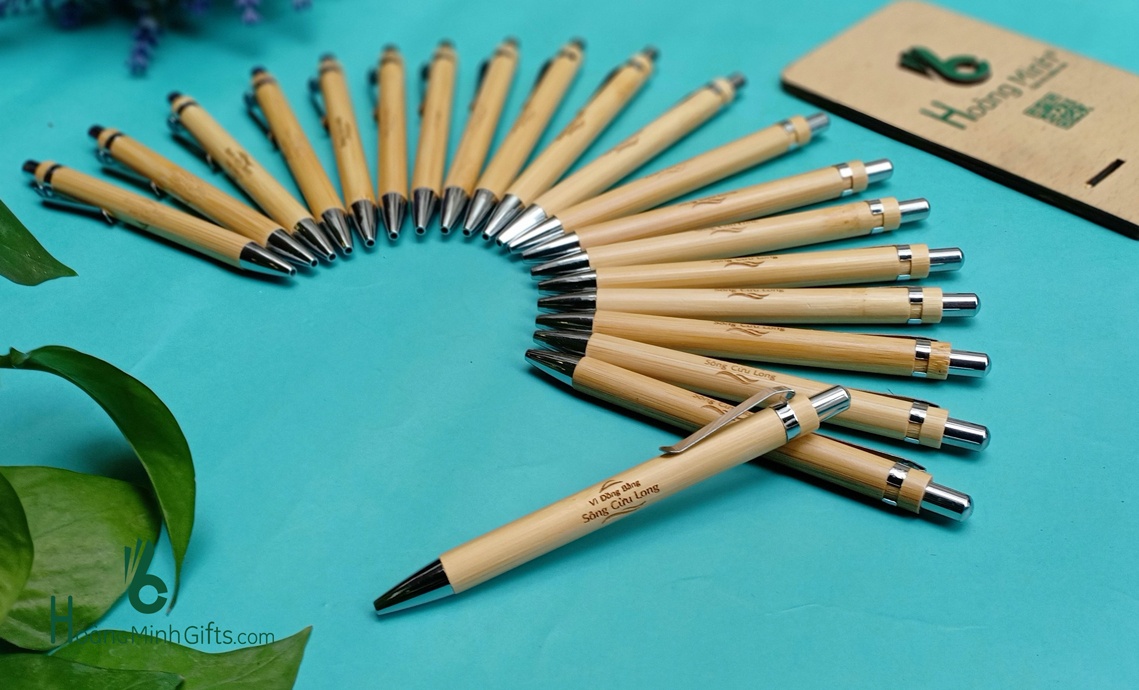 - Bút bi vỏ tre cài bạc, thân thiện với môi trường.