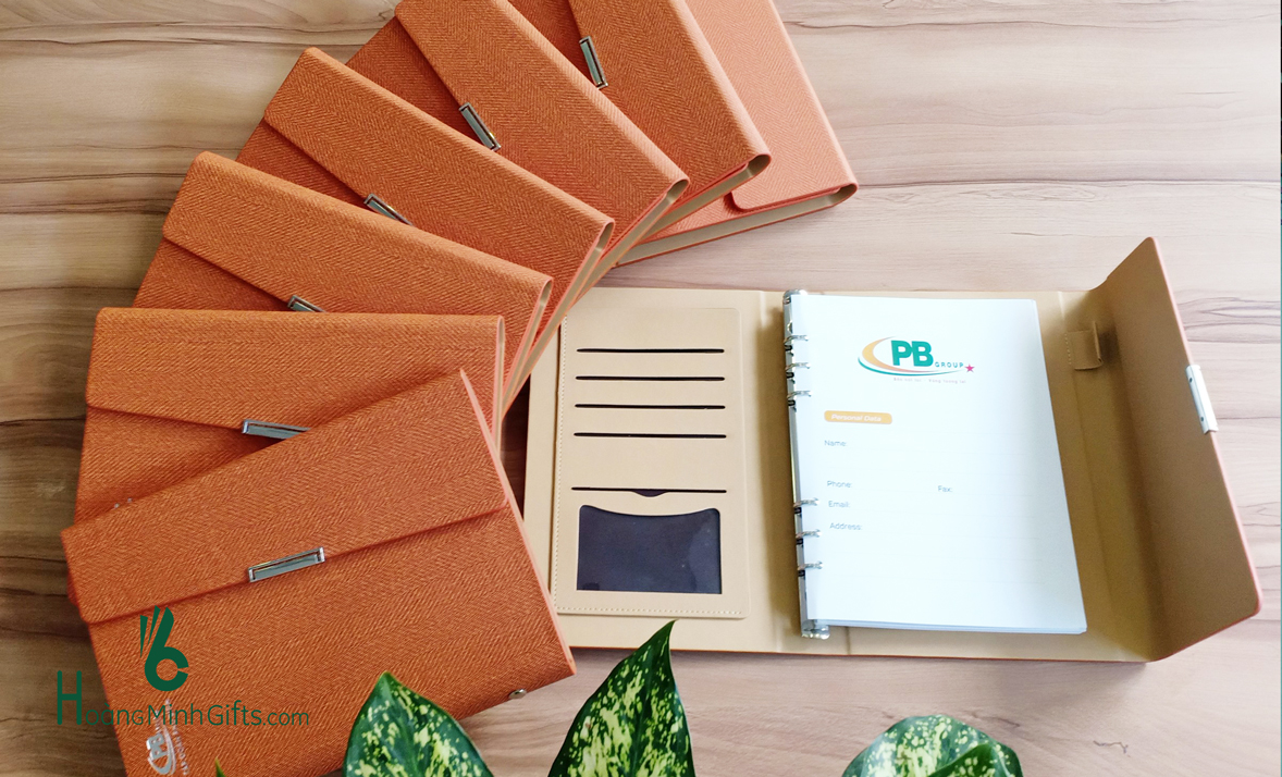 + Sổ da gáy còng A5 dập chìm, dập nhũ hoặc in màu logo trên bìa sổ theo yêu cầu