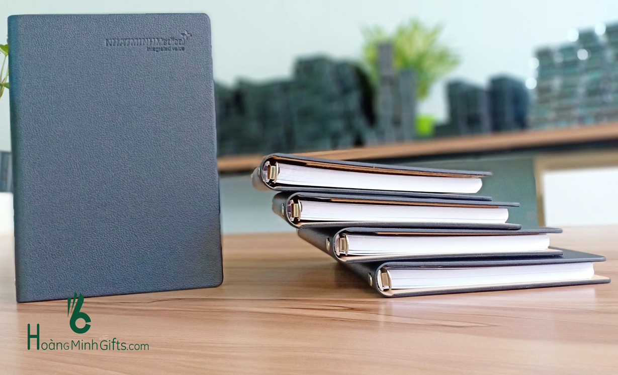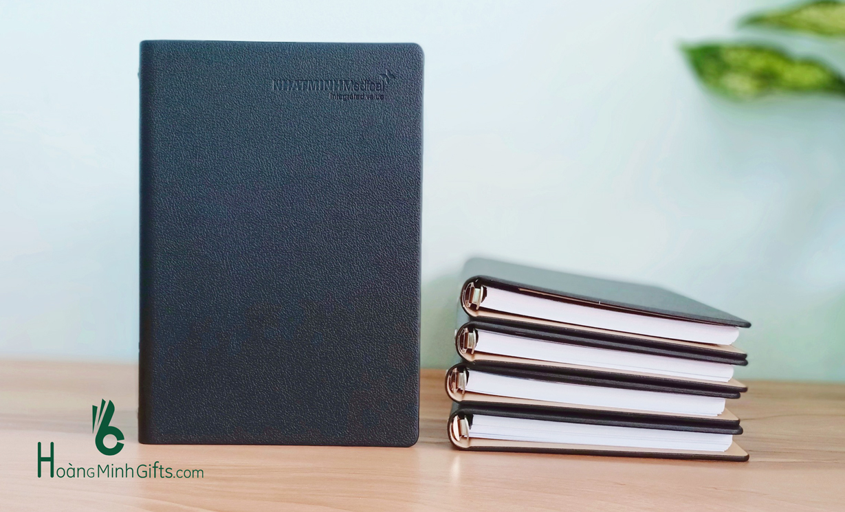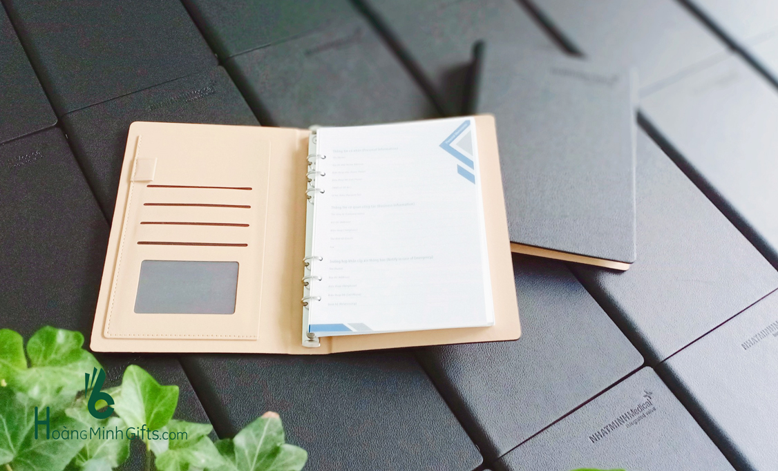Sổ da gáy còng A5 dập chìm, dập nhũ hoặc in màu logo trên bìa sổ theo yêu cầu.